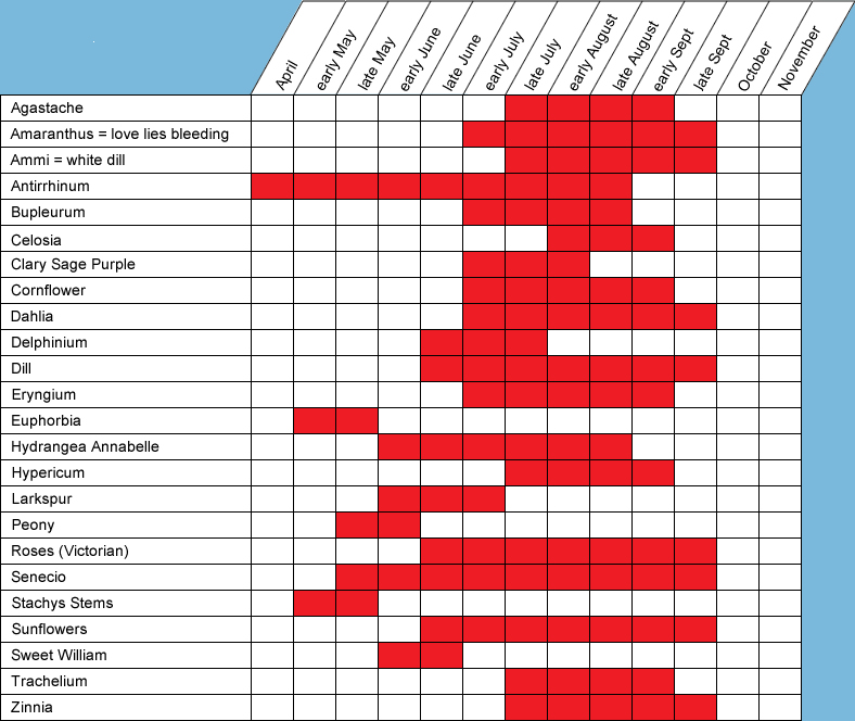 From fragrant Sweet Pea and bold Dahlia to lovely luscious Peonies, we offer a wide variety of seasonal cut flowers to choose from. If you aren’t sure what to select, we are very happy to help you pick the perfect mix. Below is a flower calender, showing seasonal availability of some of our British Blooms.