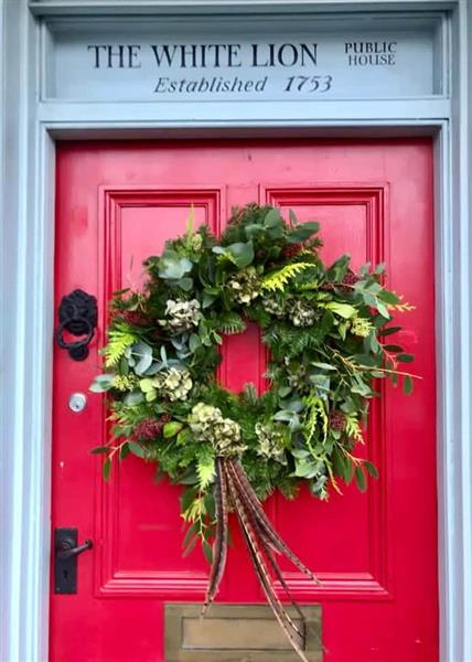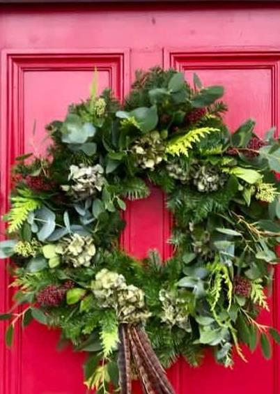 This beautiful Christmas door wreath will bring a touch of nature to grace your door. Hand decorated by us on a wire frame using UK grown foliage. Pheasant Feathers and Hydrangea complete the look.