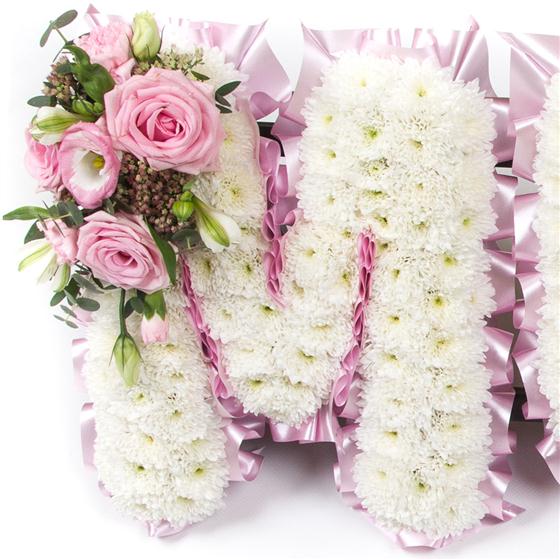 Our based letter tributes are available with a white chrysanthemum base and sprays in a range of colours.