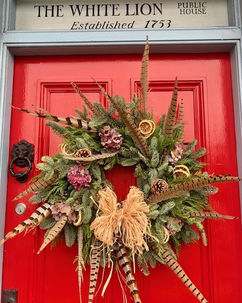 A Chiltern Hills Christmas- this eco-conscious and sustainable door wreath brings a rustic, Chiltern Hills woodland vibe to Christmas. The base is made from sustainably sourced moss and a copper wire frame. We decorate this with seasonal locally grown/British grown foliage and natural materials including Hydrangea heads, dried citrus fruits, cones and locally sourced feathers.