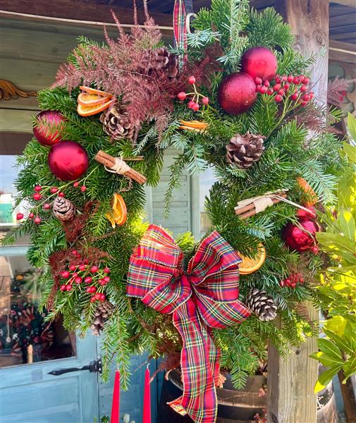 Hand made by ourselves, using a wire and moss frame and seasonal English foliage.