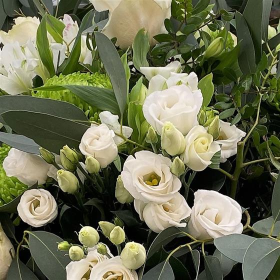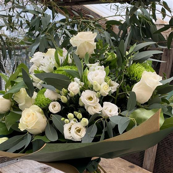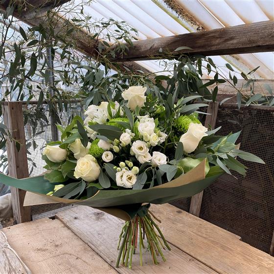 Classic elegance with our beautiful array of gentle white blooms including large head Roses, accompanied by fragrant foliage and finished with just a splash of zesty lime.