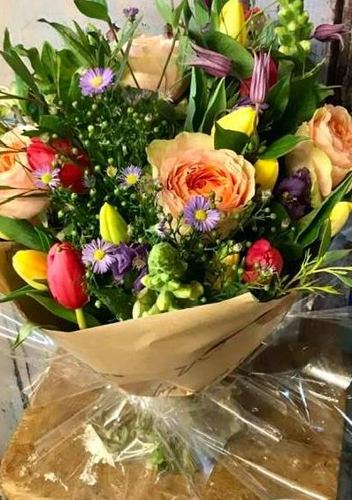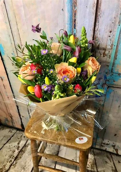 A joyful mixture of bold Tulips, soft pink or peach Roses and ditsy spring fillers.